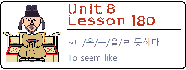 Lesson 180: In this lesson, you will learn about a way to express your inferences using a new grammatical principle.This grammatical principle is similar to 것 같다, which you learned in an earlier lesson.. In this lesson, you will learn about 듯하다. |