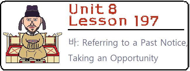 Lesson 197: In this lesson, you will learn about a complex, formal pseudo-noun. This noun is often found in notices and legal documents. In this lesson, you will learn about 바. |